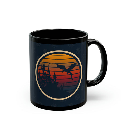 Dragon Mug With DND D20 Dice detail, House. Castle and Dragon image. Great Gift for Hotd fans, Dungeon Game Masters, fantasy Dogma fans